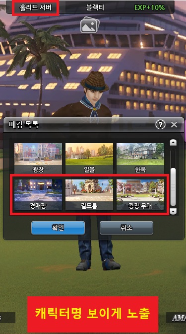 - 유람선, 경매장, 길드룸, 광장 무대 캐릭터 선택창 배경 4종을 등록합니다.