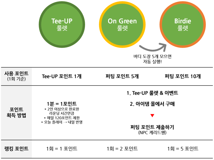 - On Green 룰렛은 1회 이용 시 퍼팅 포인트 5를 사용하며, 랭킹 포인트가 2 적립됩니다.