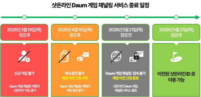| 2026년 5월 21일(목) 정기 점검 전 | Daum 게임 채널링의 계정 이전 신청 기간 종료 (점검 전까지 신청 가능) |