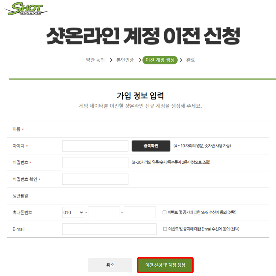 ※ 이미 웹젠 샷온라인 계정을 3개 이상 보유한 경우에도 이전 신청이 가능합니다.