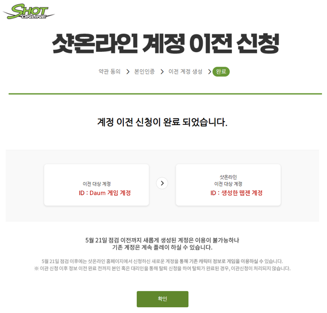 ※ 계정 이전 신청을 완료하신 후, 2026년 5월 21일(목) 점검 이후부터 Daum 게임 채널링 계정으로 이용했던 게임정보를 신청하신 웹젠 샷온라인 계정으로 이용할 수 있습니다.